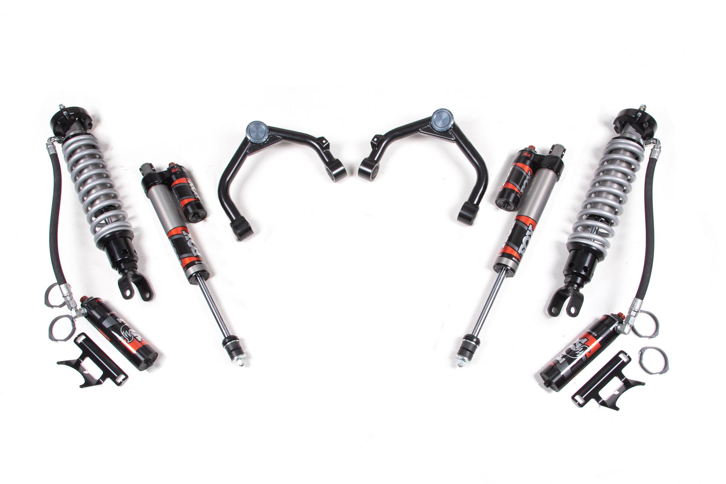 Up front the lift kit includes FOX 2.5 Performance Elite Series remote reservoir coil-over shocks and heavy duty tubular upper control arms for increased strength. In the rear this kit utilizes a complementary set of FOX 2.0 Performance shocks for the smoothest ride.