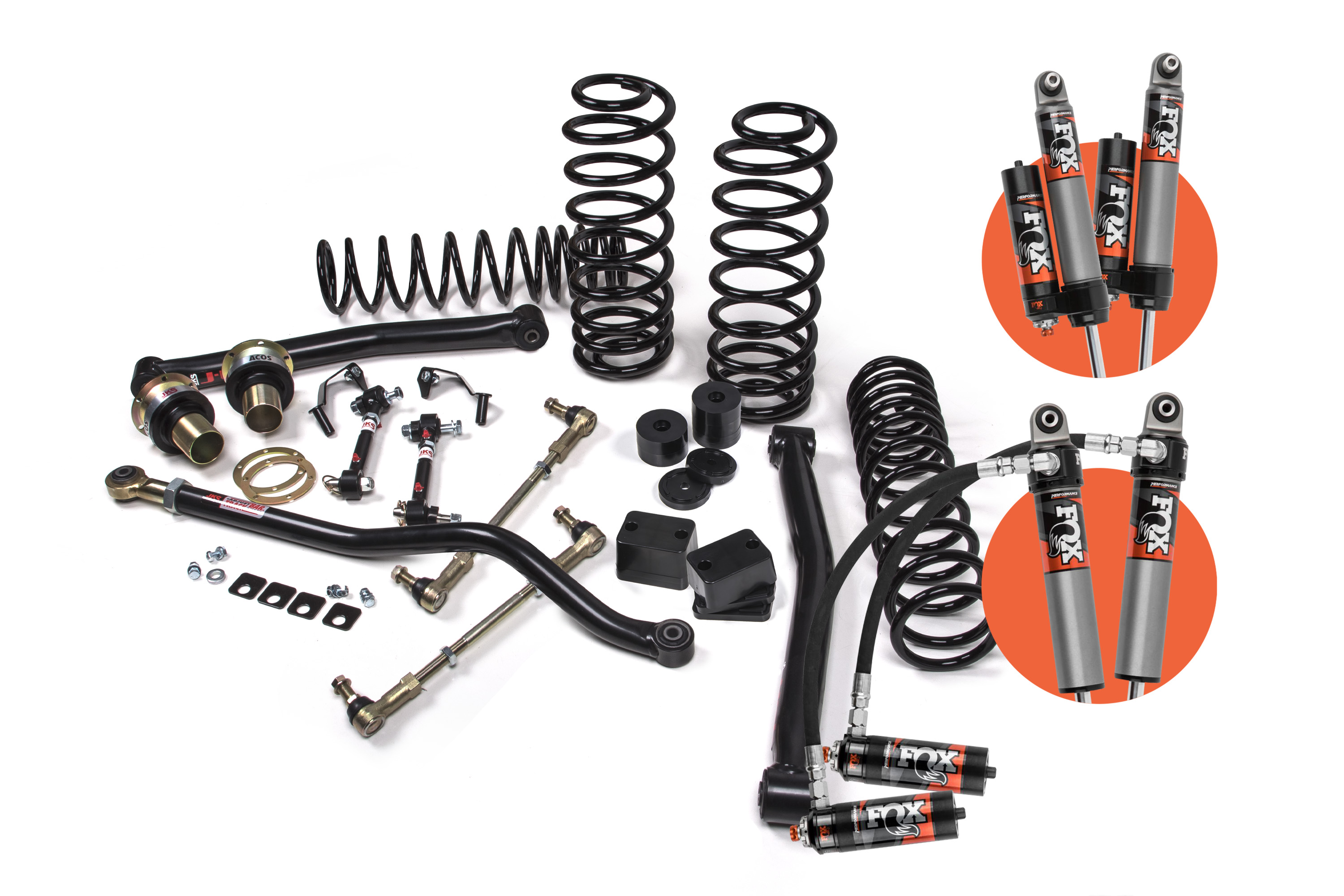 Includes one FOX88326050, Kit: 2018-2024 Jeep JL, Front, 2.5 Truck PES, R/R, 2-3 inch Lift, DSC, UPC Code 788000424322 Includes one FOX88326054, Kit: 2018-2024 Jeep JL, Rear, 2.5 Truck PES, P/B, 2-3 inch Lift, DSC, UPC Code 788000424285 Includes one JKS1621, 2018-2024 Jeep Wrangler JL Fixed Front LCA - J-L k, UPC Code 814897012332 Includes one JKS1671, 2018-2024 Jeep Wrangler JL Fixed Rear LCA - J-L k, UPC Code 814897012349 Includes one JKS2571, 2018-2024 Jeep Wrangler JL Rear ACOS Spacer Kit, UPC Code 814897012448 Includes one JSPEC1258, 2018-2024 Jeep Wrangler JL 2.5 inch Rear Coil Spr inchg Kit - HD, UPC Code 814897012301 Includes one JSPEC1314, 2018-2024 Jeep Wrangler (JL) J-Lander Ma inch Box Kit, UPC Code 814897012615 Includes one JSPEC1352, 2018-2024 Jeep Wrangler (JL) / 2020-2024 Jeep Gladiator (JT) 3.5 inch Front Coil Spr inchg Kit - HD, UPC Code 814897012370