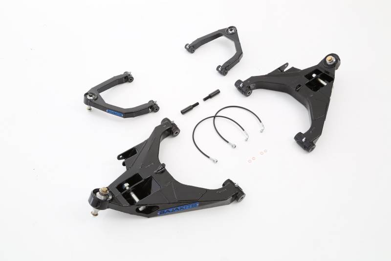 Baja Kits Long Travel Prerunner Suspension Kits excel in the dirt while retaining excellent on-road handling and comfort. They are a direct bolt-on for your 2WD & 4WD F-150, and Raptor. Engineered to be a complete long travel suspension system, front kits use Trophy Truck grade uniball spherical bearings and high grade hardware on both the upper and lower arms for ultimate strength. Three inch longer per side than stock, heavy duty, fabricated steel box construction arms handle the abuse. The longer arms have built in zerk fittings to allow lubrication. While increasing track width, Baja Kits long travel prerunner kits fit on any standard alignment rack. Particular attention has been paid to correct castor angle so the steering is easy, comfortable, and predictable. The custom tuned King coilover shocks with remote reservoirs and compression adjusters provide precise tuning and controlled suspension damping. *Optional 3.0 inch bypass shock upgrade available that can be added at any time after the kit is installed.