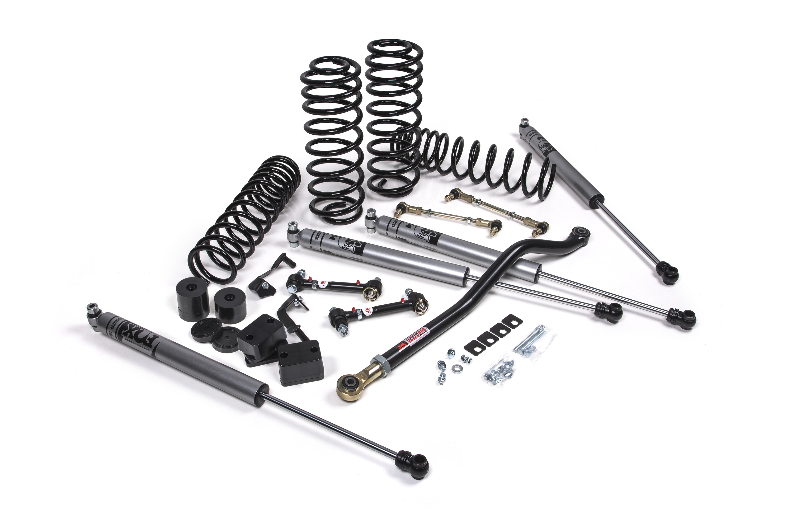 This complete, bolt-on system includes matched JSPEC dual-rate coil springs, front adjustable track bar, rear track bar bracket, front sway bar Quicker disconnects, bump stop extensions, caster plate alignment correction and your choice of Jspec or Fox shocks. On the street, J-Venture provides exceptional ride quality and handling.
