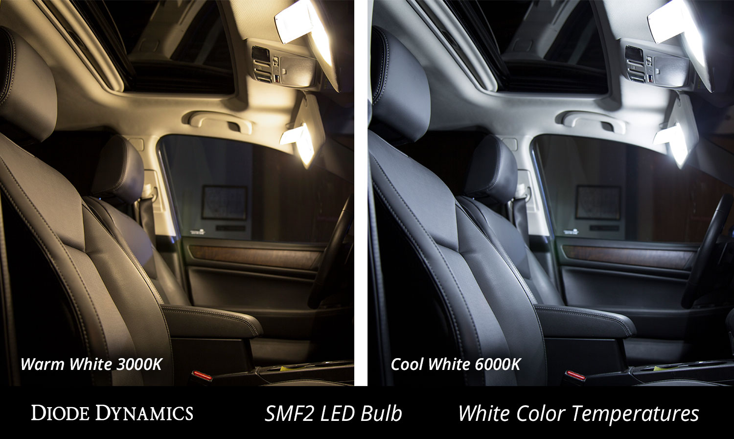 Design. The 28mm SMF2 LED bulb is a direct replacement for any 28mm-size bulb, commonly found in vanity mirror lights in many vehicles. Populated with two 5050-size SMDs, the SMF2 upgrades the factory yellowish incandescent bulb to a more modern LED appearance, while adding far more total light output than the factory bulb. The SMF2 was designed with an embedded load resistor and implanted diode for superior reliability. With its durable metal terminals, it will fit snugly in the socket, and its light weight means it won't vibrate loose over time.