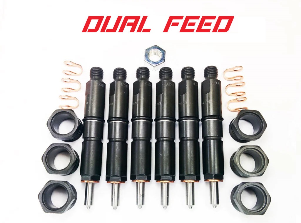 Dodge 94-98 12 Valve Injector Set: Custom built Dual Feed injector set. Our Dual Feed injectors come built with internal body modifications to match customer's intended power goals and intended use.