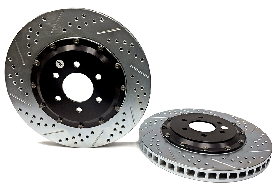 The EradiSpeed+ is a direct replacement 2pc rotor for the 2003-2010 Dodge Viper. This is designed to work with the stock 4 piston brake system. These 14 inch rotors feature directional vanes, which advances cooling efforts, and are a 2pc design with an anodized black 6061-T6 aluminum center hat bolted to the rotor ring, greatly reducing weight.