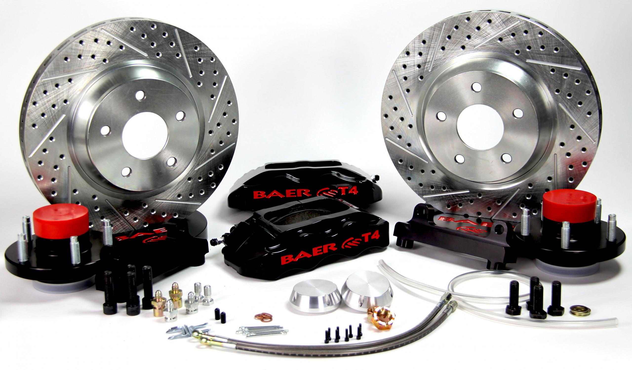 This front system features the T4 4-piston caliper mounted to a 13 inch 1-piece slot, drill, zinc plated rotor. Baer systems include stainless steel brake hoses as well as calipers that have D.O.T. compliant dust and weather seals. Machined hubs will come pre-assembled with quality bearings, studs and packed with Redline Synthetic grease.