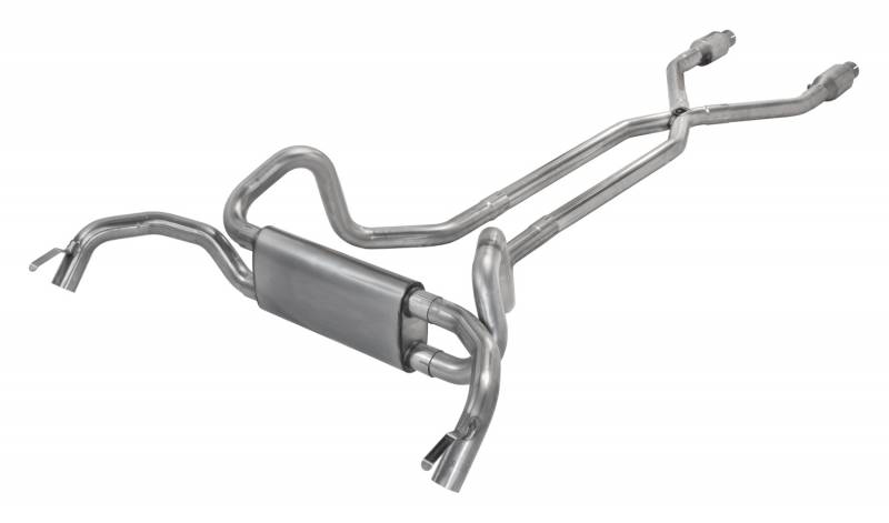 All other systems include a flow path that create turbulence and restricted flow in the muffler. This header back system includes a driveshaft tunnel X crossover kit for maximum ground clearance even on lowered vehicles. Manifold downpipes are available as an option for those that do not have headers. Great for even the highest performance(up to 600hp) applications where ground clearance and oem 'look' is a priority.