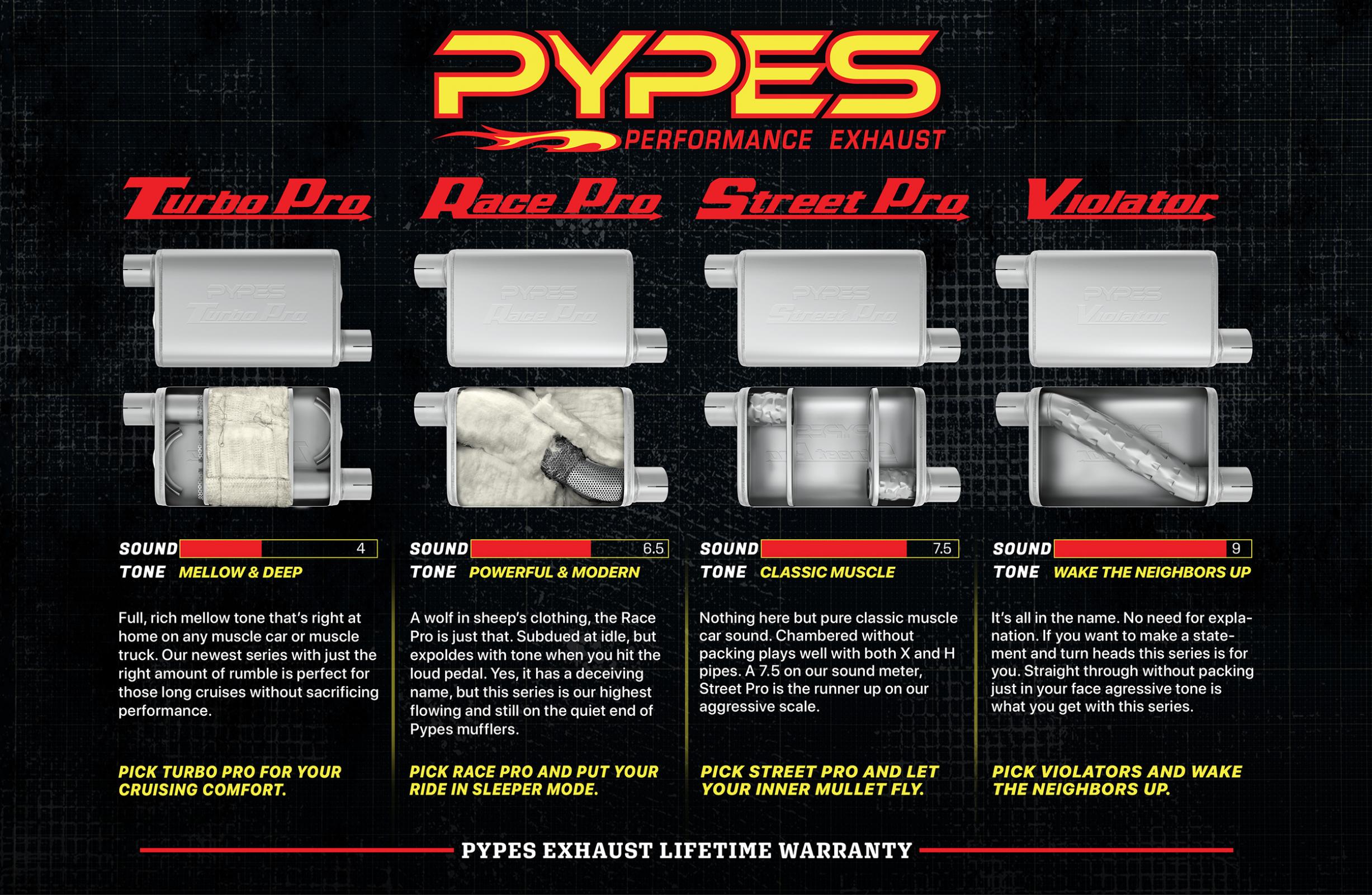 Pypes Exhaust Systems are designed to deliver enhanced performance, provide extra punch in the passing lane and improve gas mileage. Fabricated using the highest quality materials, our smooth, 16 gauge, mandrel-bent, Stainless steel pipe ensures maximum exhaust gas flow, which can significantly boost horsepower.