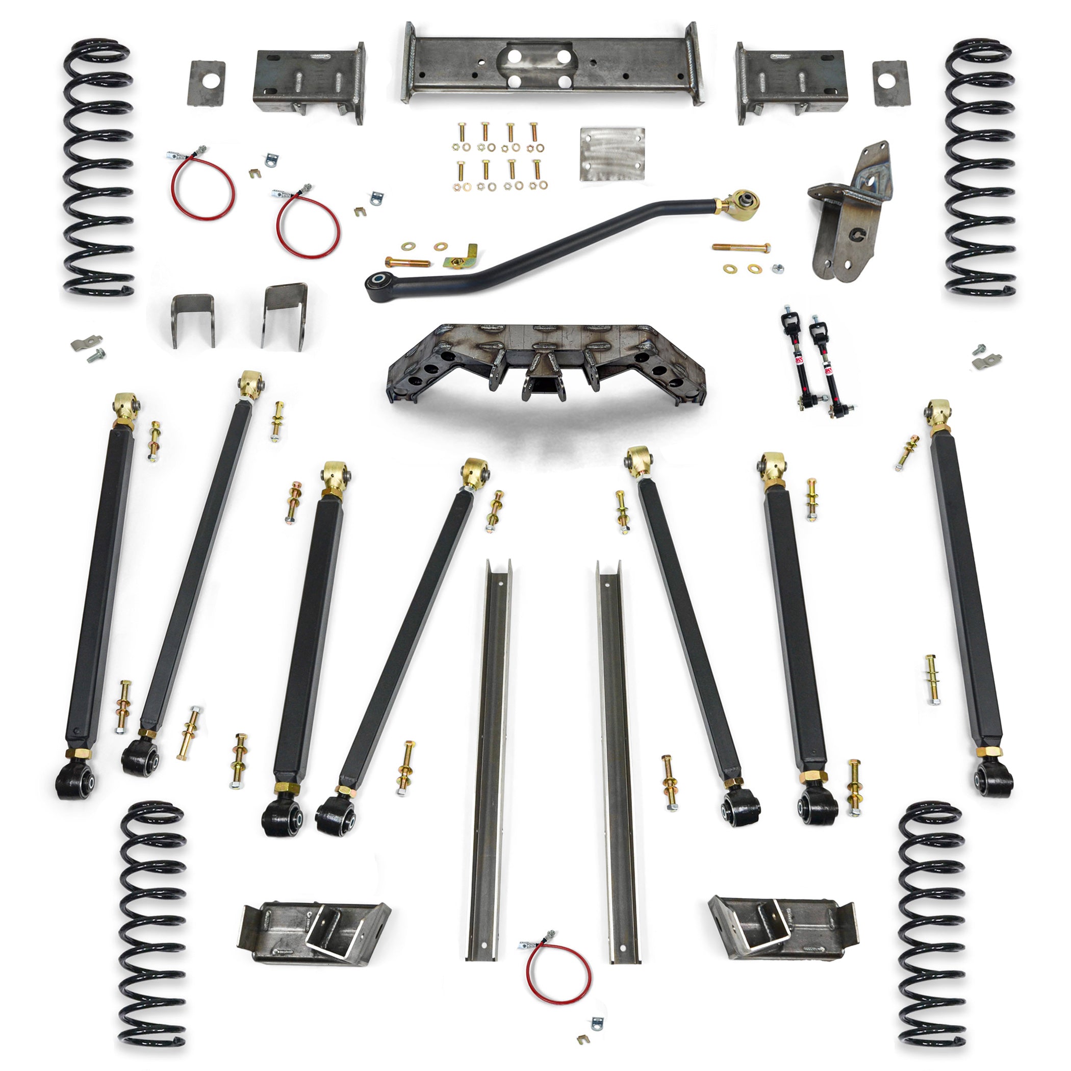 Kit includes, a front 3 piece cross member, unibody rails, rear frame brackets, rear 4 link truss, all 8 adjustable control arms with Hardware, front and rear coil springs, front and rear brakelines, front adjustable trackbar and drop bracket, drop pitman arm, front sway bar disconnects and front spring retainers.