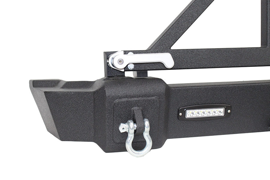 The Fishbone Offroad Rear Bumper with Tire Carrier is ready for anything you can throw at it. The tire carrier pivot point is designed for ease of use, with a heavy duty tapered roller bearing to support the weight of your tire, and can be opened and closed with minimal effort. The bumper includes two LEDs that can be wired as backup lights or auxiliary lights. It also has welded d-ring shackles with 2 d-rings included, so you're ready to hit the trail out of the box.