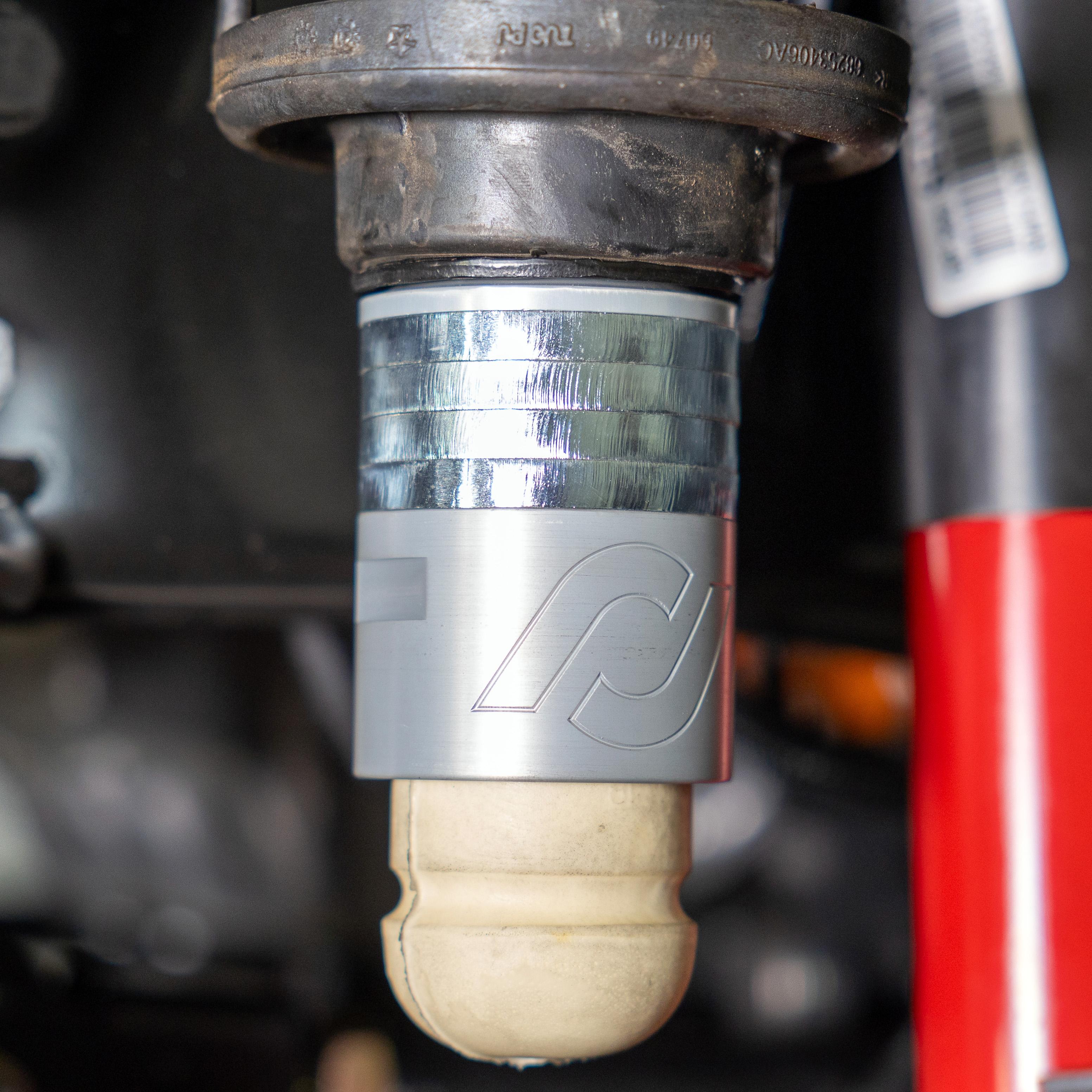 The vehicle's factory yellow bump stop cushions are retained and relocated by inserting them back into the bottom of the new aluminum RockJock bump stop bodies. This provides factory feel when the bump stops make contact.