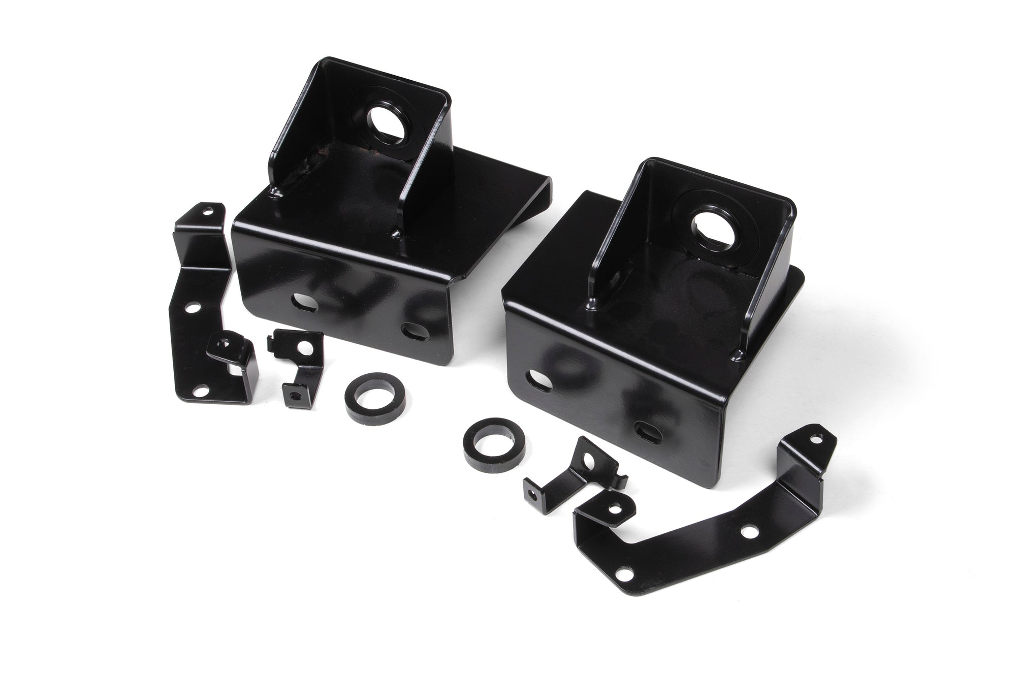High strength body mount brackets improve clearance while allowing compatibility with stock and aftermarket stubby bumpers.
