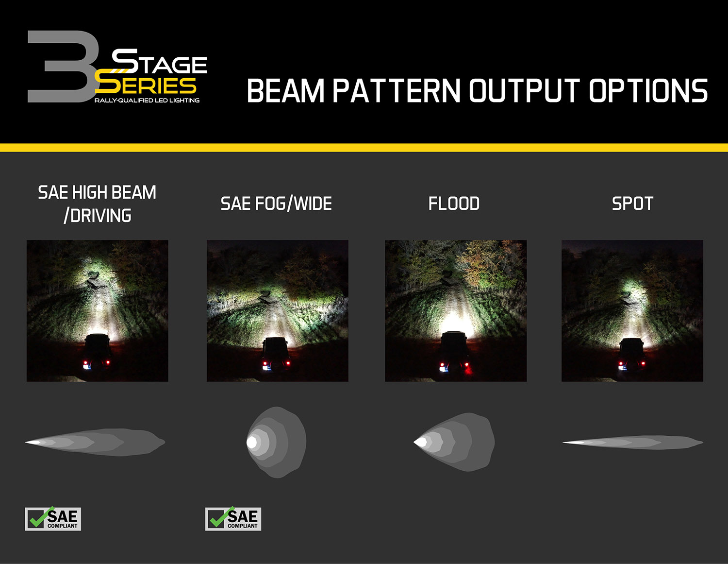 Functional Patterns. All Stage Series beam pattern options were designed with optical simulation modeling, to shape the output in a highly-functional beam pattern. No matter what your auxiliary lighting needs are, there is a Stage Series optic for you!