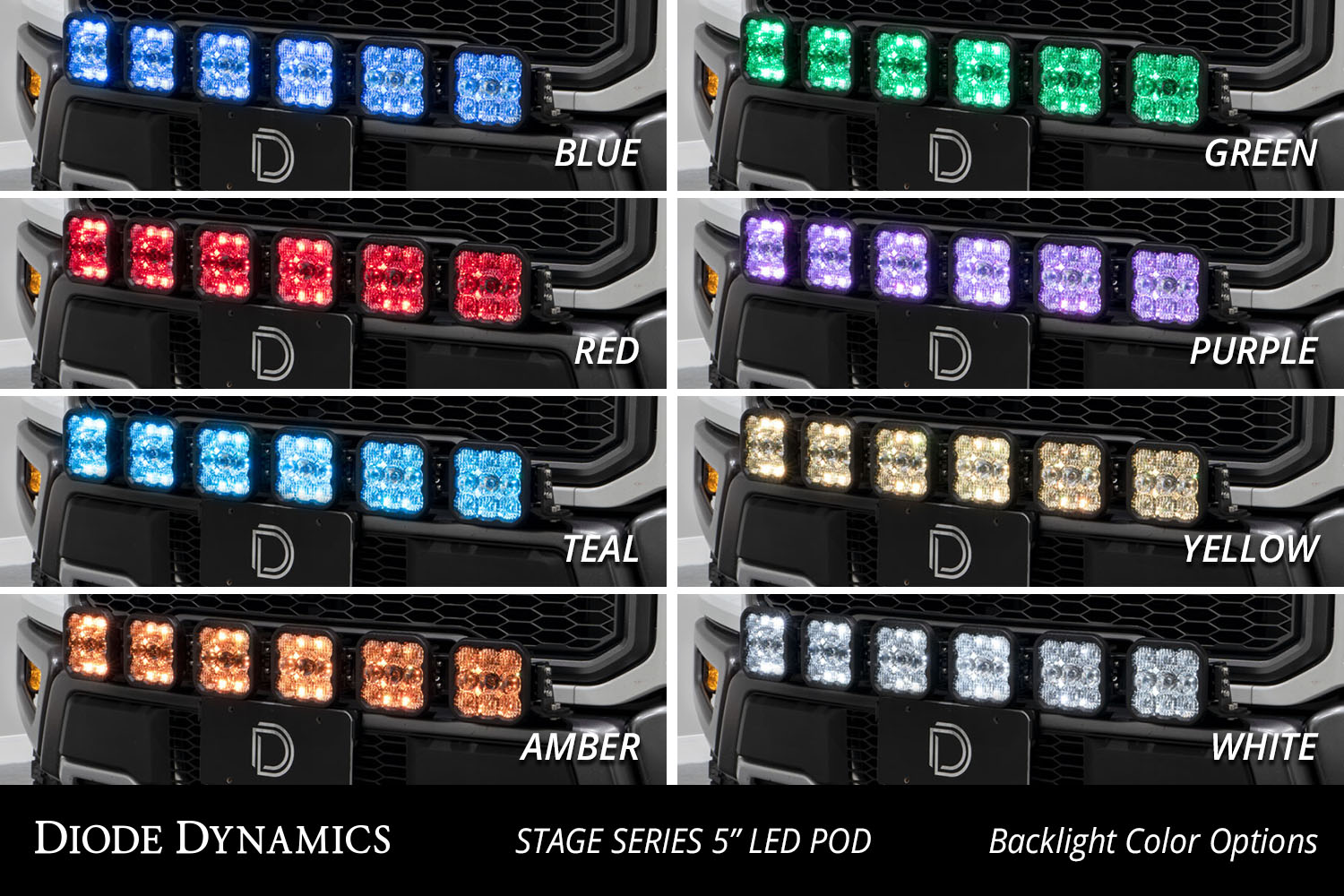 Selectable Backlight. The Stage Series 5inch LED Pods included in the White kit feature a selectable backlight with eight different color options perfect for an extra styling accent or for more visibility when you're not using the main beam. Selecting your backlight color is easy - simply alternate the power on and off! The SS5's backlight fully illuminates the TIR optic providing unique accent lighting that you won't find on other LED pods. Note: Due to the yellow lens the Yellow kit is only available with an Amber backlight color.