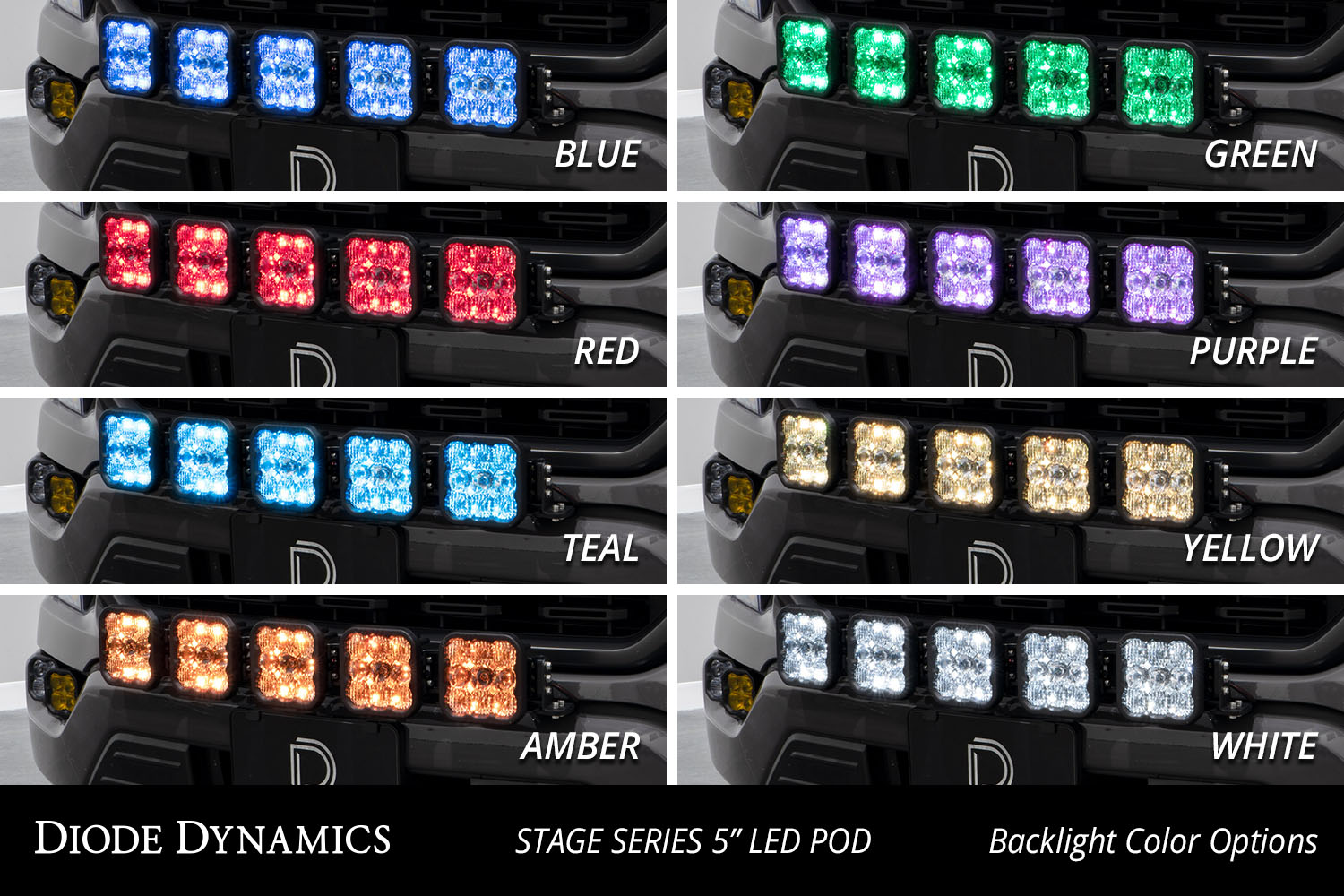 Selectable Backlight. The Stage Series 5inch LED Pods included in the White kit feature a selectable backlight with eight different color options perfect for an extra styling accent or for more visibility when you're not using the main beam. Selecting your backlight color is easy - simply alternate the power on and off. There's no complicated programming with a controller! The SS5's backlight fully illuminates the TIR optic providing unique accent lighting that you won't find on other LED pods. Note: Due to the yellow lens the Yellow kit is only available with an Amber backlight color.
