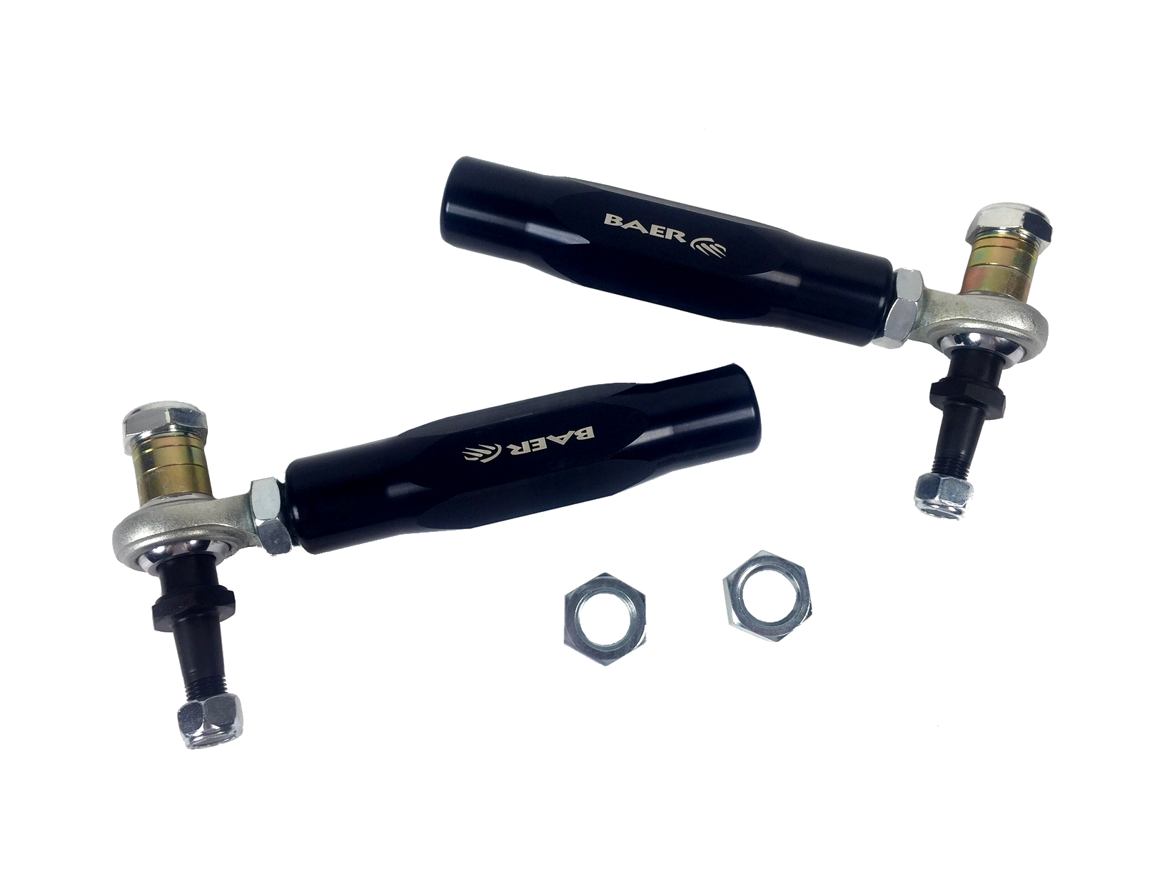 The BAER Trackers feature a 6061 T-6 fully machined sleeve that is anodized black, that is mated to a Teflon lined heim joint and machined pin which has correct taper so spindles are not required to be drilled/modified. These are vehicle specific pieces that help correct bumpsteer issues do to modified suspensions and/or poor OE design. Best of all these are made in the USA!